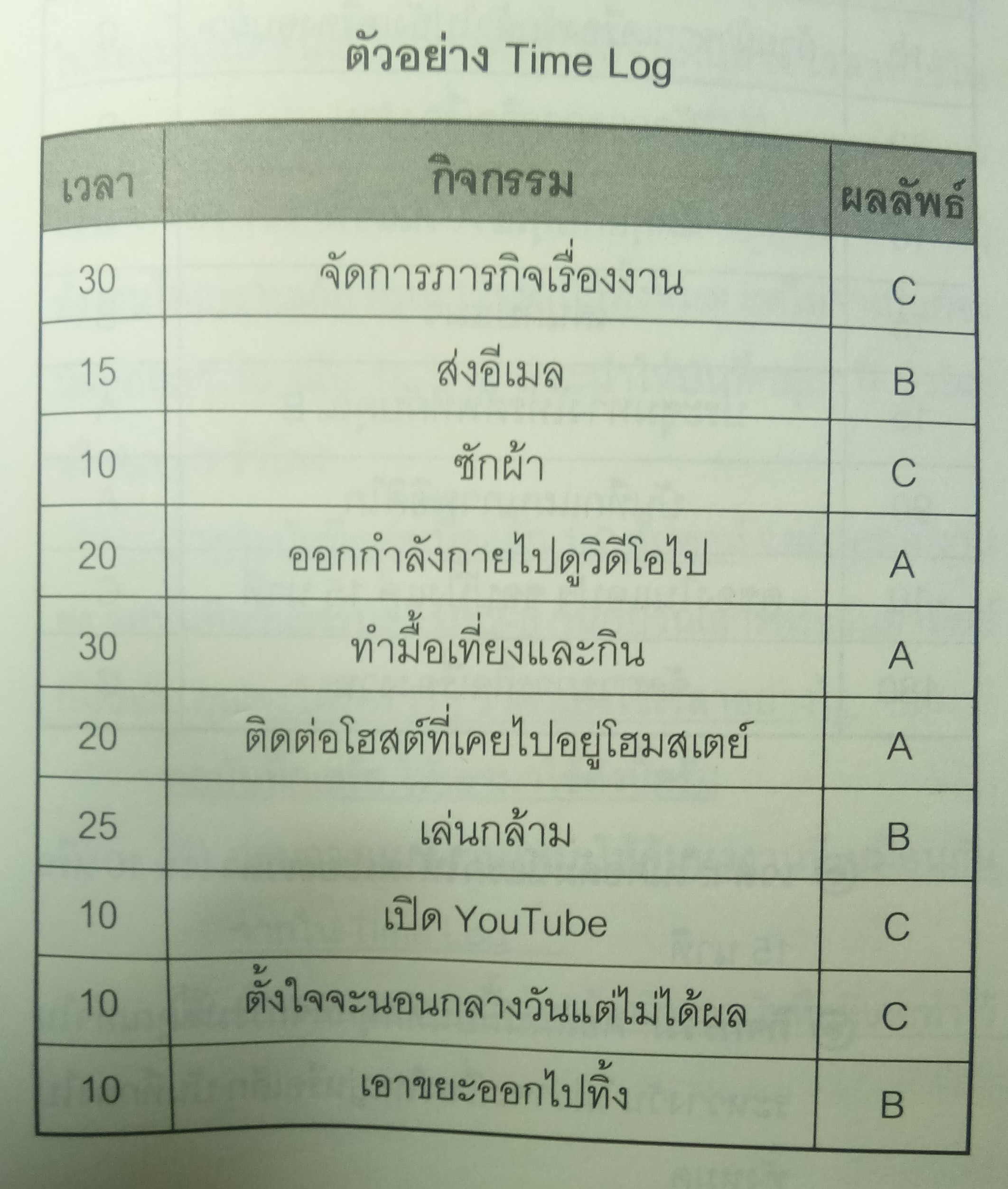 บันทึกทุกสิ่งที่ทำใน 1 วัน ทั้งงานใหญ่ งานเล็ก บันทึกไว้ทั้งหมด ควรบันทึกต่อเนื่องสัก 1-2 สัปดาห์ จะได้รู้คร่าว ๆ ว่าตัวเองใช้เวลาอย่างไร พอบันทึกเสร็จให้เอามาใช้ดังนี้