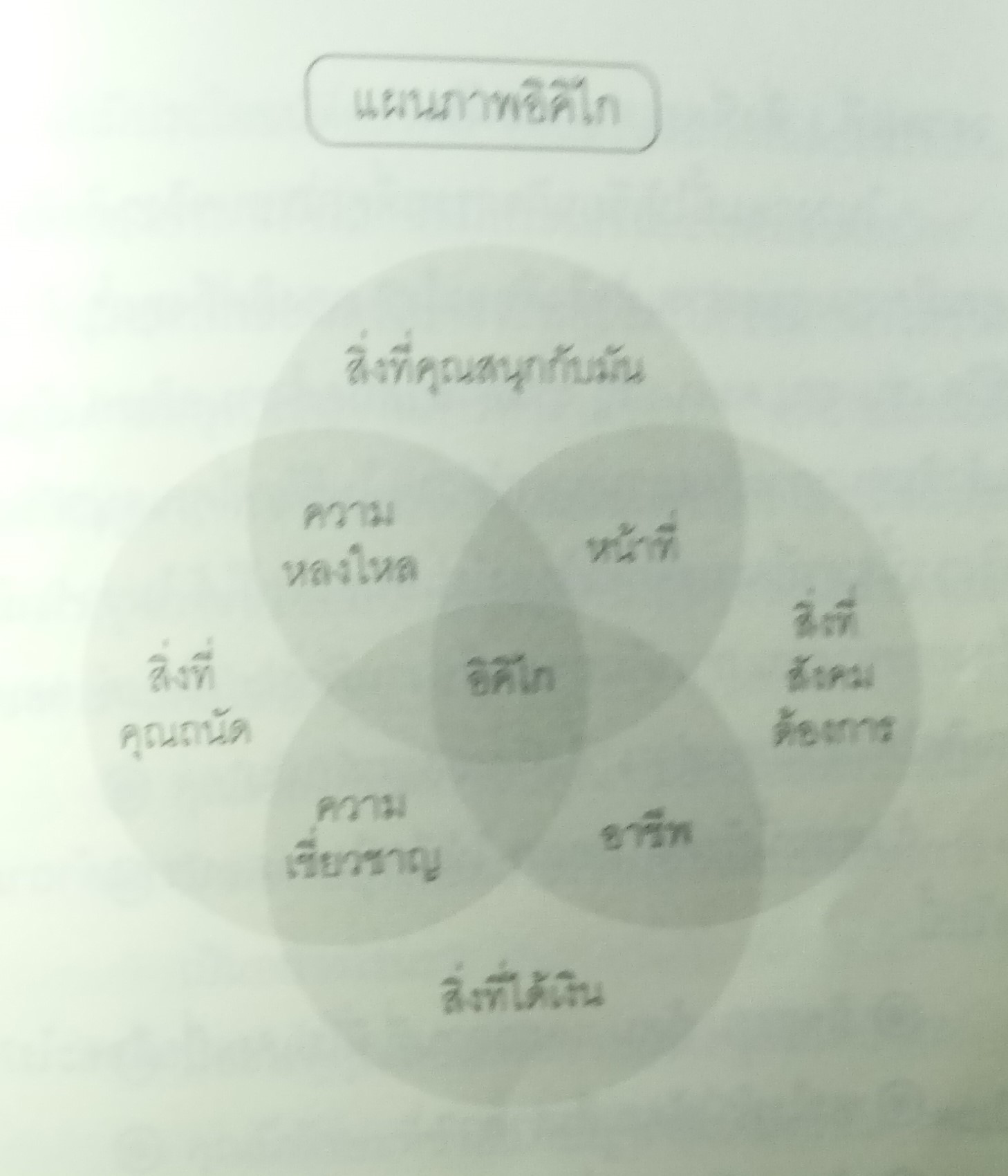 แผนภาพอิคิไก เทคนิคนี้มาจากคำว่า อิคิไก ในภาษาญี่ปุ่น ซึ่งในช่วงไม่กี่ปีที่ผ่านมานี้ คนยุโรปและอเมริกานำมาใช้เพื่อเป็นวิธีทบทวนชีวิตของตัวเองใหม่อีกครั้ง คำว่าอิคิไกมีหลายความหมาย แต่ในที่นี้ให้คิดว่ามันเป็นกิจกรรม หรือเป้าหมายที่ทำให้มีแรงจูงใจ และหมกมุ่นอยู่กับมันใน