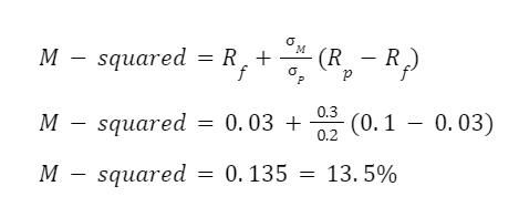 M-squared สามารถคำนวณได้จากการนำ Sharpe ratio มาคูณด้วยส่วนเบี่ยงเบนมาตรฐานใหม่ แล้วบวก Risk-free rate กลับเข้าไป มีสูตรการคำนวณดังนี้