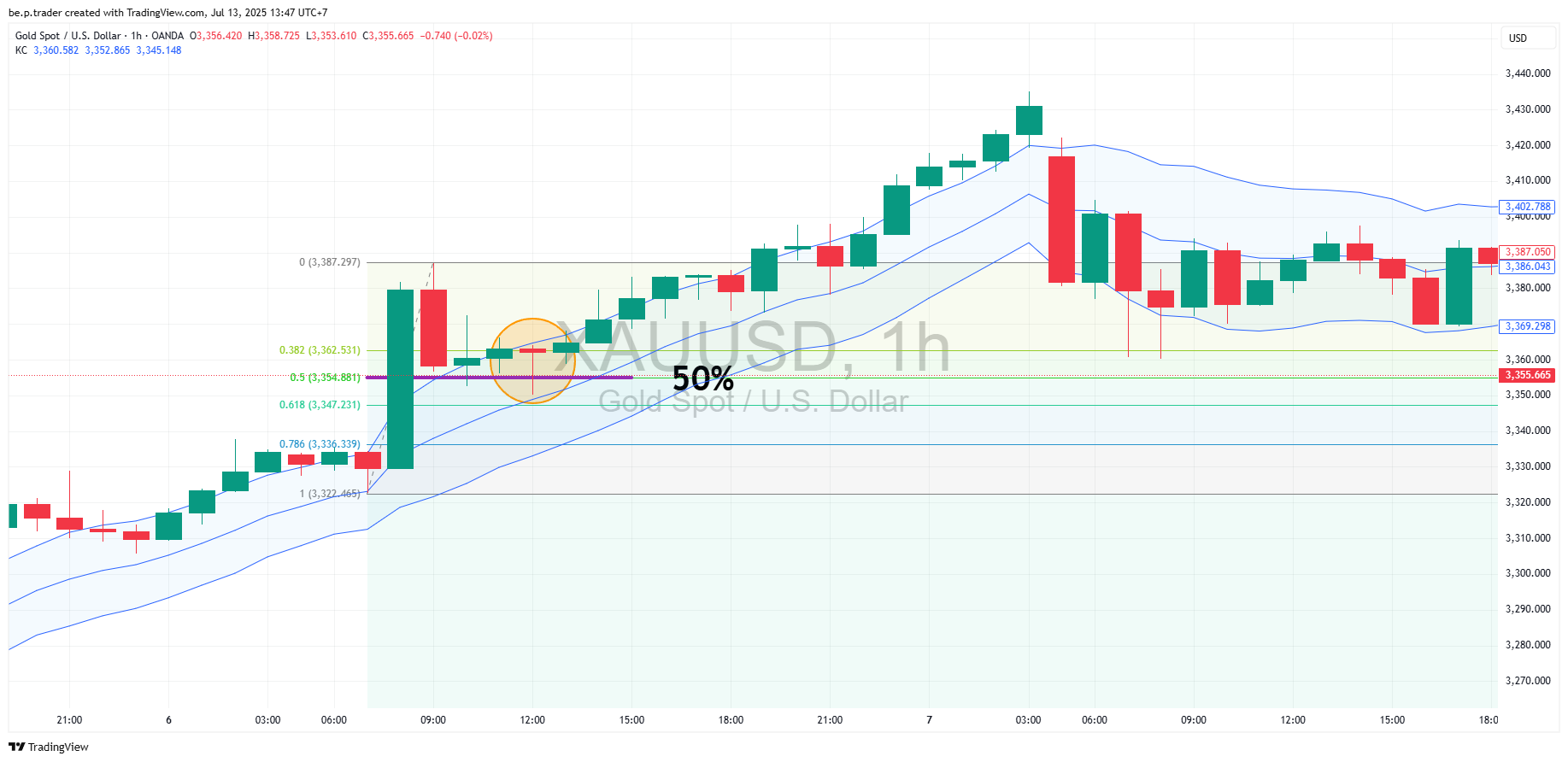 กราฟทองคำในภาพราย 60 นาที โดยใช้ Keltner bands ที่ตั้งค่าค่าเฉลี่ย MA อยู่ที่ 10 วัน และ 1 ATR