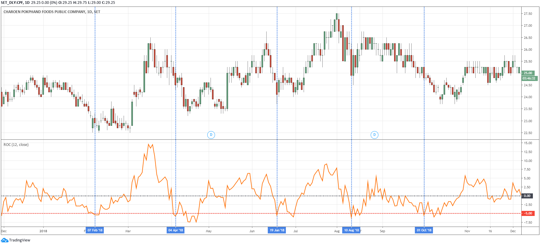 ตัวอย่างกราฟหุ้น CPF กับ ROC 12 วัน โดยใช้ระดับ Oversold ที่บริเวณ -5% จะเห็นได้ว่าเมื่อ ROC ลงมาต่ำกว่าระดับ -5% มักจะเป็น Low ของรอบการแกว่งตัว สามารถใช้จับจังหวะในการสร้างกำไรได้