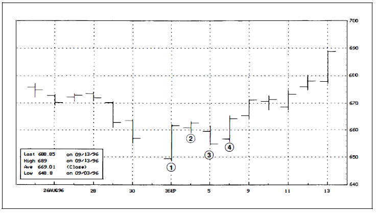 1. ราคาทำจุดต่ำสุดในรอบ 8 วัน (แท่งแรก)