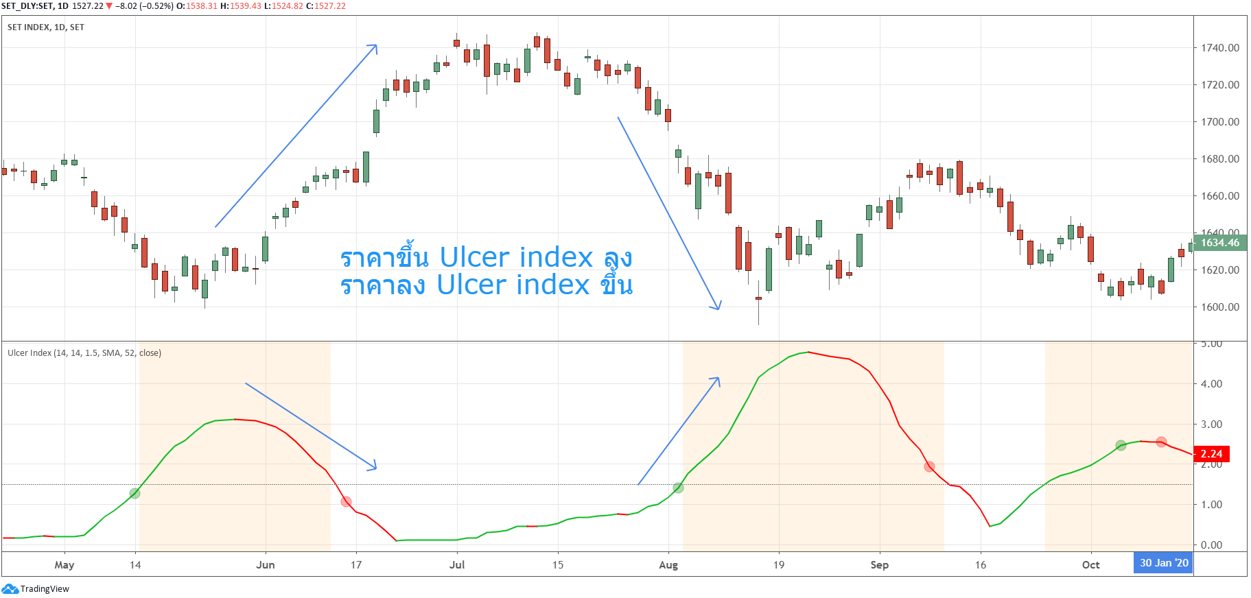 Ulcer Index ไว้วัดความลึกการลงและระยะเวลาการลงของราคา เมื่อค่า UI (Ulcer Index) สูงขึ้น หมายความว่าราคากำลังปรับตัวลง (ช่วงภาวะ Drawdown) ส่วนในที่ค่า UI ปรับตัวลง หมายความได้ว่า ราคากำลังปรับตัวขึ้น หรือ ไม่ไปไหน